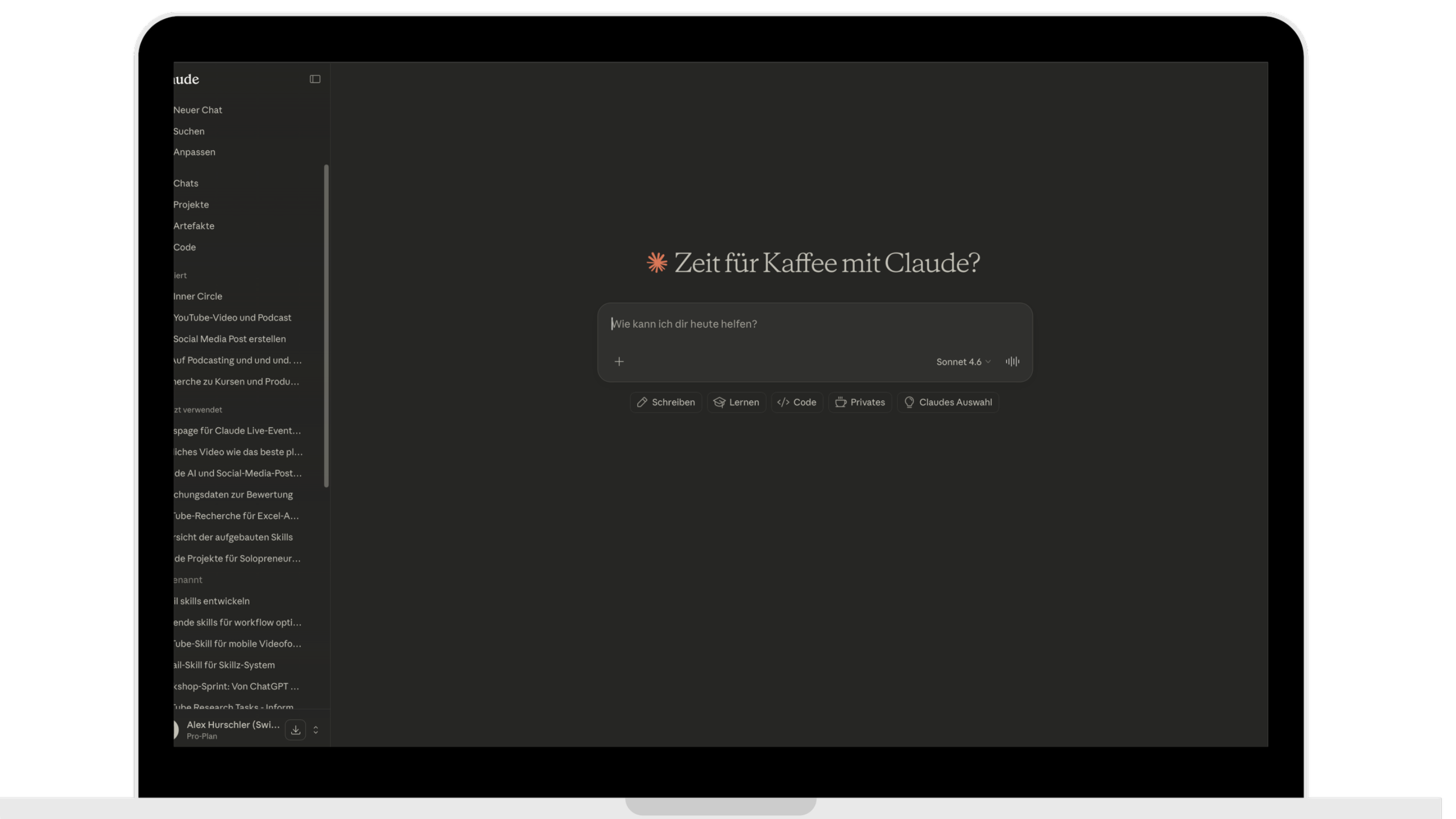 Du öffnest Claude. Zwei Minuten. Du weisst was heute zählt. Deine E-Mail ist in dreissig Sekunden fertig. Dein nächstes Video steht schon auf der Liste. Du arbeitest fokussiert – und hörst früher auf als sonst.